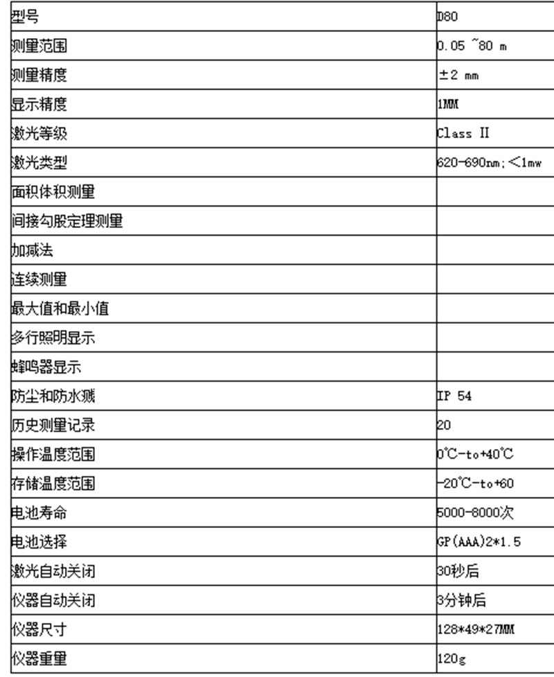 直接距離測量●面積、體積測量●勾股定理測量●連續(xù)及最大最小值測量●數(shù)據(jù)加減運算●定時測量●公制或英制單位切換●數(shù)據(jù)儲存及調(diào)用