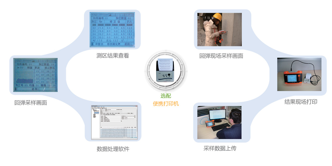 ?、葸x配便攜式打印機(jī)可以隨時(shí)進(jìn)行原始回彈值、測(cè)區(qū)或構(gòu)件強(qiáng)度值的打印。特別適合現(xiàn)場(chǎng)會(huì)議、政府部門(mén)組織的工程質(zhì)量檢測(cè),各職權(quán)部門(mén)進(jìn)行的監(jiān)督抽查等。